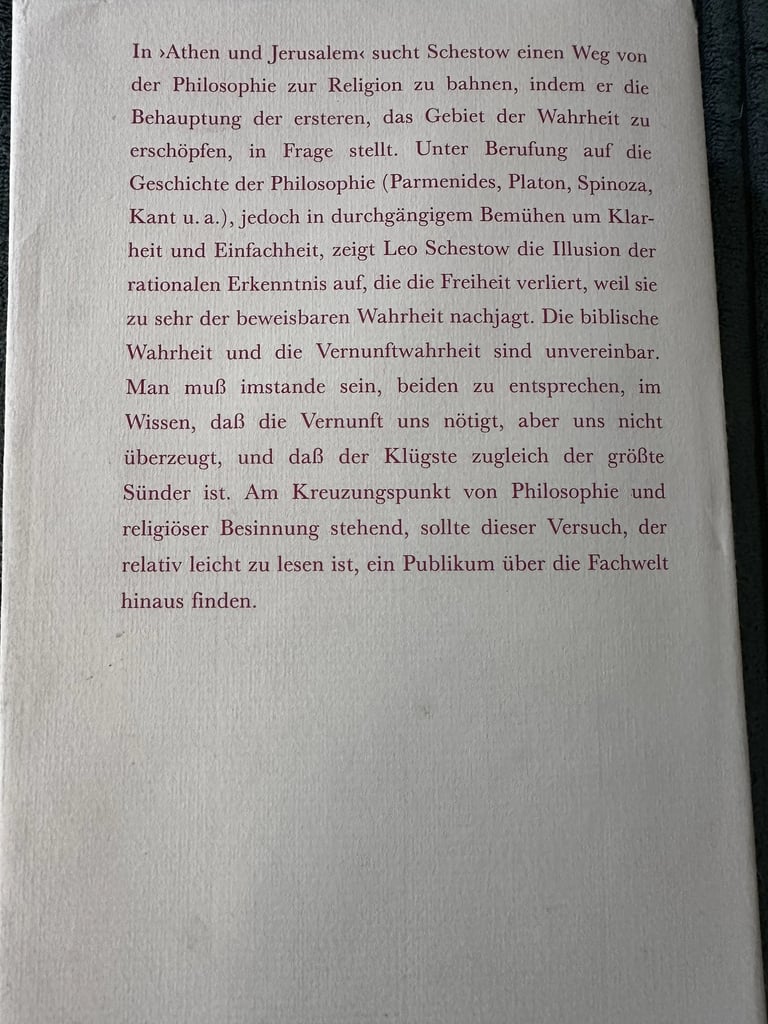 Besonders positiv finde ich die letzten circa 100 Seiten. Dort wird Schestow fast zahm, stellt eine im Verhältnis dazu fast zärtliche, menschliche und ehrliche Seite dar. Im vierten Teil „Von der zweiten Dimension des Denkens“ wechselt der Ton: weg von der Polemik hin zu einer persönlicheren, fast normalen Schreibweise. Er spricht von biblischem Glauben, von Hiob, der gegen die Notwendigkeit aufbegehrt, von Abraham, für den Gott das Unmögliche möglich macht, und von der Freiheit, die jenseits aller Vernunft liegt – wo für Gott „nichts unmöglich“ ist und selbst das Vergangene nicht mehr unabänderlich sein muss. Seine Schrift wird noch klarer, beinahe normal. Man könnte fast meinen, es wäre gar kein Philosoph, der hier schreibt, sondern ein Mensch, der aus tiefer, existentieller Erfahrung heraus spricht. Das ist die Jerusalem-Seite: der Glaube, der die Tyrannei der Vernunft bricht und echte Freiheit schenkt.